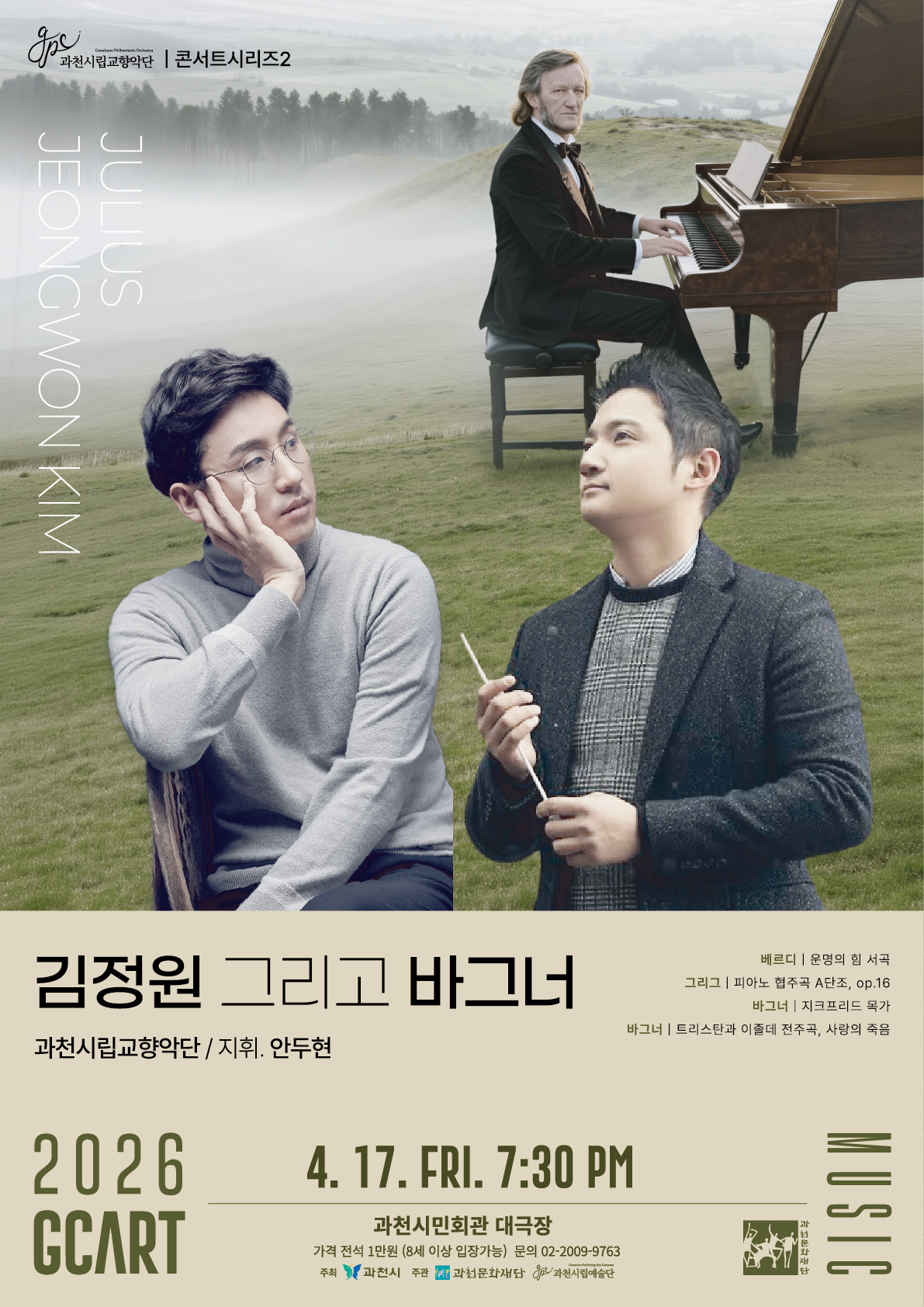 이번 무대는 지휘자 안두현의 지휘 아래 과천시립교향악단이 연주를 맡고, 국내 정상급 피아니스트 김정원이 협연자로 참여한다. 김정원은 빈 국립음대 최연소 수석 입학 및 최우수 졸업, 파리 고등국립음악원 최고연주자 과정 수료 등 탄탄한 이력을 바탕으로 세계 유수의 공연장에서 활약해온 연주자로, 섬세한 터치와 깊이 있는 해석으로 평단과 관객의 호평을 받아왔다. 이번 공연에서도 그만의 음악적 내공이 돋보이는 무대를 선보일 예정이다.