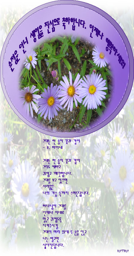 <정운언니, 있잖아요 저 꽃이름 외우는데 3년 걸렸수. 무식할 때는 들국화만 있는 줄 알았는데 무슨넘의 이름들이 그렇게도 많은 지, 벌개미취. 어서 외우시기를. 산에 가다 들에 가다 저런 꽃만 보면 난 무조건 벌개미취라고 우겼죠. 우기는데에는 장사 없더이다. 걍 무조건 벌개미취인 걸요. 많은 사람들, 벌개미취라는 말을 들어봤어야 아니라고 딴지라도 걸 것 아녜요. 담번에 시험볼터이니 지발 잊지말아주셈>