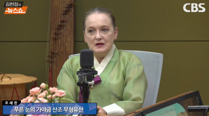 ◇ 김현정> 화제의 인터뷰 시간입니다. 전북 무형유산 40호가 가야금 산조입니다. 이 소중한 유산을 지키기 위해서 전수자, 이수자, 보유자 그리고 인간 문화재를 지정하는데요. 여기에 드는 일이 여간 어려운 일이 아니랍니다. 그런데 지난 봄, 우리나라 최초의 푸른 눈을 가진 외국인 이수자가 탄생했습니다. 미국 알래스카 출신의 조세린 교수. 돌아오는 가을에 가야금 기인 산조 음반 발표를 앞두고 계세요. 오늘 화제의 인터뷰에서 직접 만나봅니다. 배제대학교 아펜젤러 국제학부의 조세린 교수, 어서 오십시오. 교수님.
